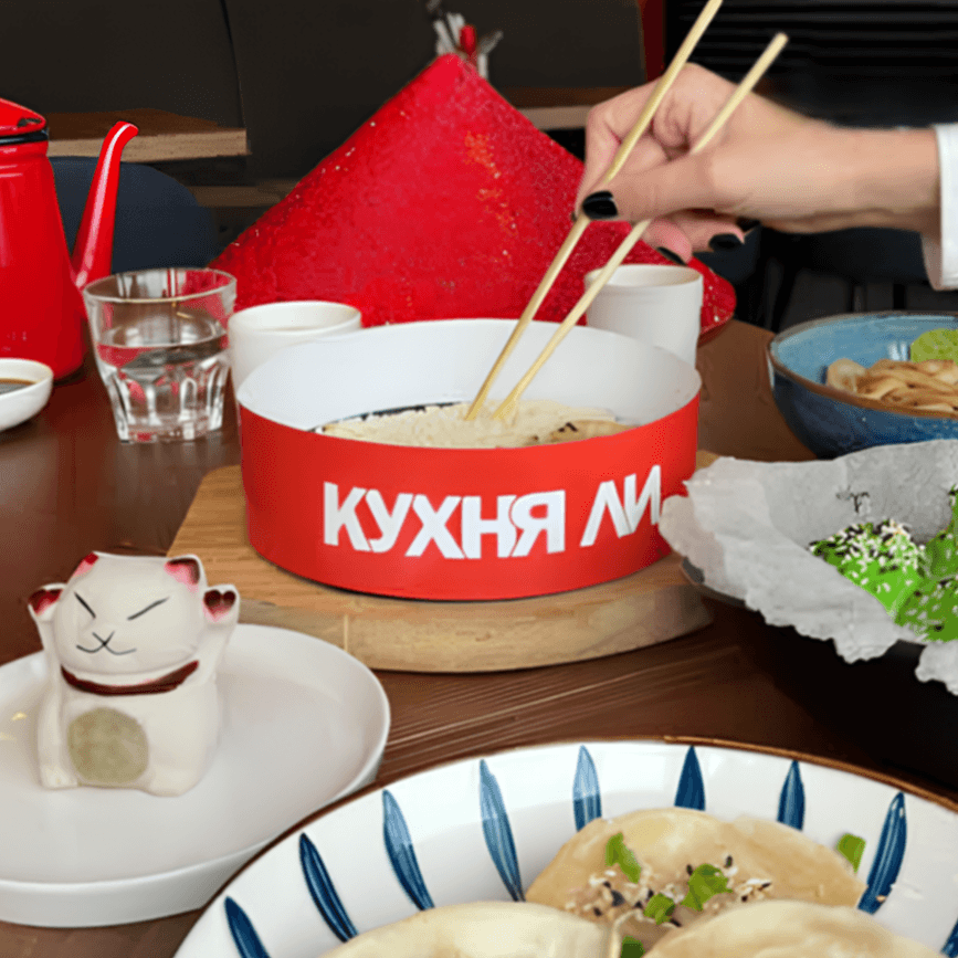 Для ресторана «Кухня Ли» мы разработали комплексный фирменный стиль, который стал визуальным воплощением философии заведения. Работа включала полный цикл создания айдентики: от режимок и стикеров до всех прикладных элементов — меню, упаковки, этикеток для собственной продукции и рекламных баннеров