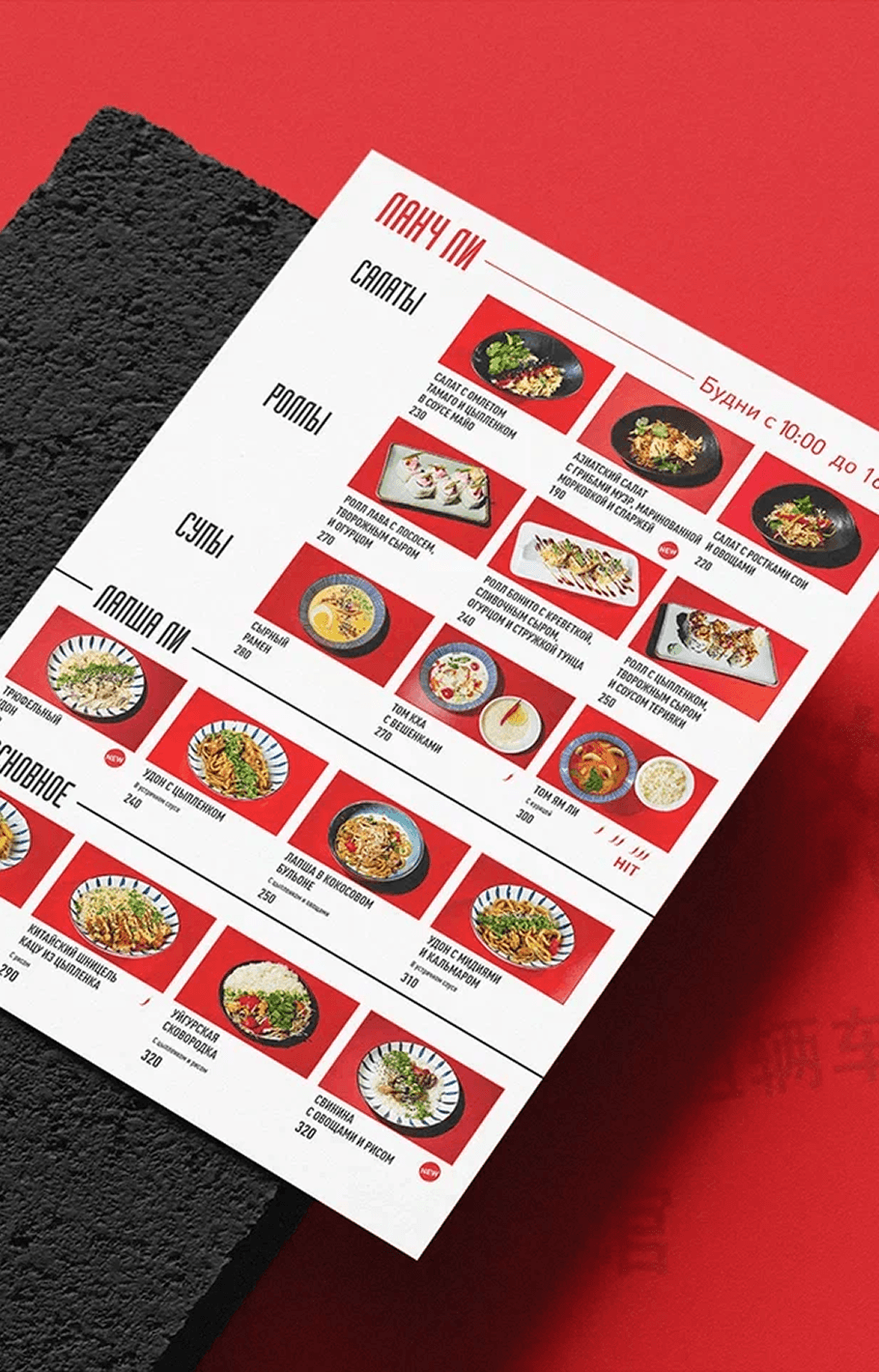 Создание фирменного стиля для китайского ресторана «Кухня Ли», включающее разработку визуальных элементов, разных видов меню, упаковок, этикеток, рекламных баннеров и общей концепции дизайна.