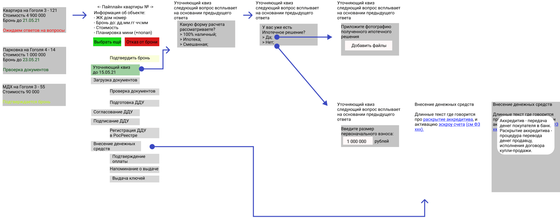 По каждому помещению, которое покупает пользователь, он видит актуальное состояние и ход сделки. Течение сделки представлено в виде пайплайна, где видно какие действия находятся на стороне отдела продаж, а какие он должен сделать сам