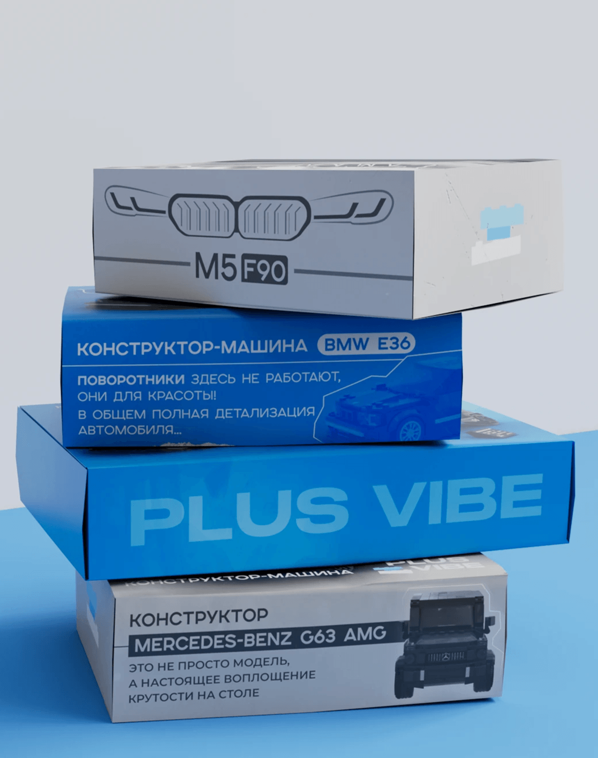 В процессе работы разработана уникальная айдентика и стиль упаковки, который визуально отражает характер и эстетику каждой отдельной модели автомобиля и в то же время формирует целостный бренд-образ для PLUS VIBE